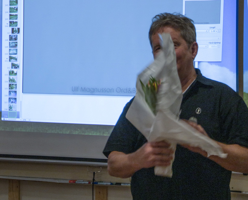 Efter ett helt fantastiskt föredrag som inom parentes också sågs av Ulfs chef på den tiden, fick han mottaga en välförtjänt blombukett av Håkan Söderström. Men som den fotograf han är trivs han bäst bakom kameran.