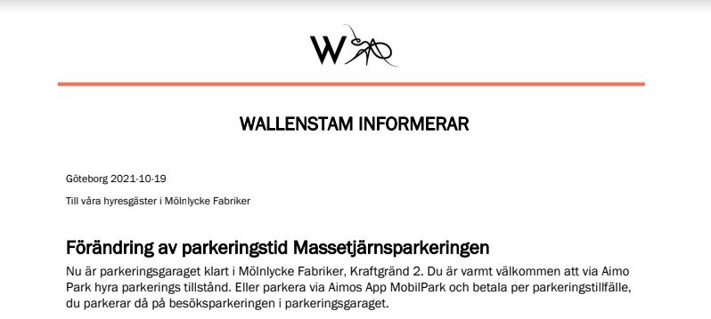 WALLENSTAM INFORMERAR om parkering inom fabriksområdet.