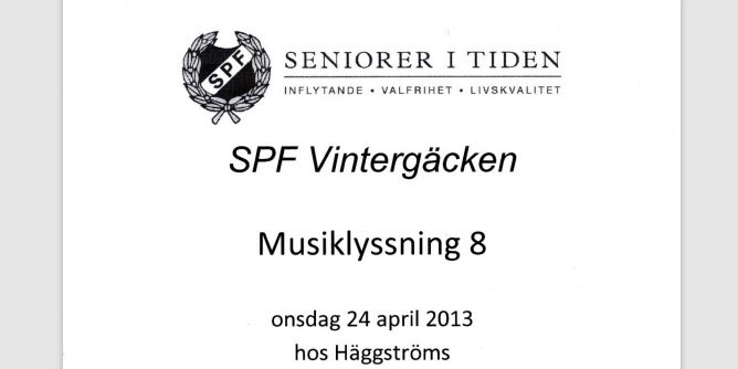 Kolla gärna det ambitiösa programmet för Våravslutningen Och, som sagt, i Höstprogrammet 2024 pågår lyssningen fortfarande under ledning av Gunnar Häggström. Inlägg 2024-07-10: Bengt G Bengtsson, 0P739-47 27 70, bengt.g.bengtsson@gmail.com Är du nyfiken på våra övriga "Huvudnyheter" (bildspelet) och "Senaste Nytt"? Klicka här