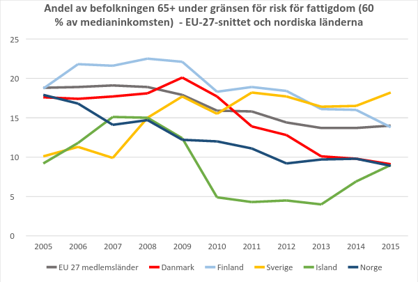 Både andelen och antalet svenska pensionärer som lever under EU:s gräns för risk på fattigdom (60 % av medianinkomsten, ca 12 100 kr/mån) ökar. Det visar färska siffror från Eurostat (EU-kommissionens statistik). Samtidigt är trenden de senaste 10 åren snarare den motsatta i övriga nordiska länder och för genomsnittet i EU:s 27 medlemsländer (28 stycken från år 2014).