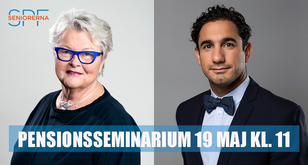 Den 19 maj kl 11-12 bjuder SPF Seniorerna in till ett webbsänt seminarium om pensioner. Deltar gör preliminärt Ardalan Shekarabi (S), Ida Gabrielsson (V) och Katarina Brännström (M) samt Eva Eriksson (SPF Seniorerna), Håkan Svärdman (Forena) och Staffan Ström (Alecta).