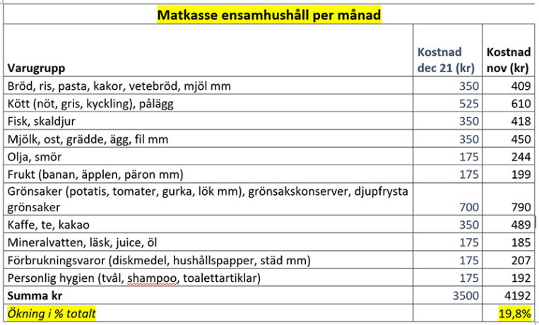 Under det senaste året har livsmedelspriserna ökat kraftigt. Det innebär enligt SPF Seniorernas beräkningar att matkostnaderna har stigit från cirka 3 500 till 4 192 kronor per månad, eller nära 20 procent, för ett singelhushåll.
