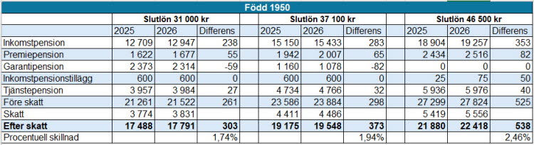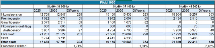 Beräkningarna nedan visar hur pensionen 2026 kommer att se ut för en person född 1950: