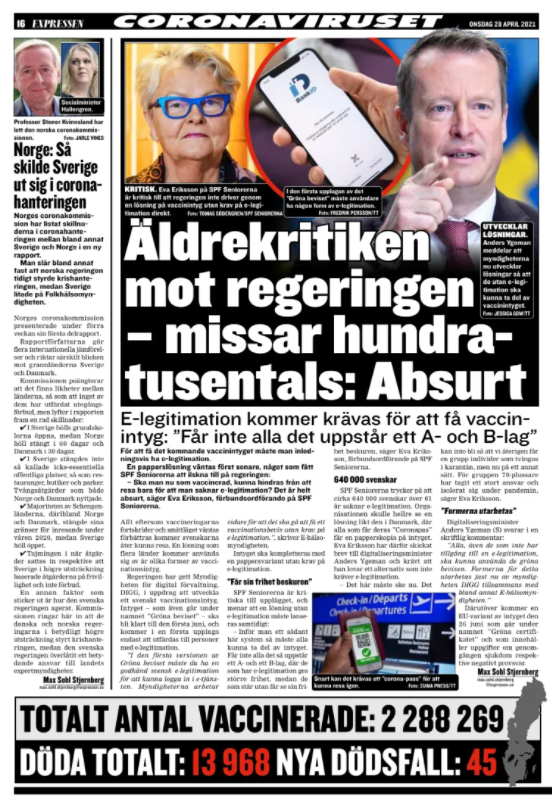 Eva Eriksson i Expressen om krav på e-legitimation för att få vaccinintyg
