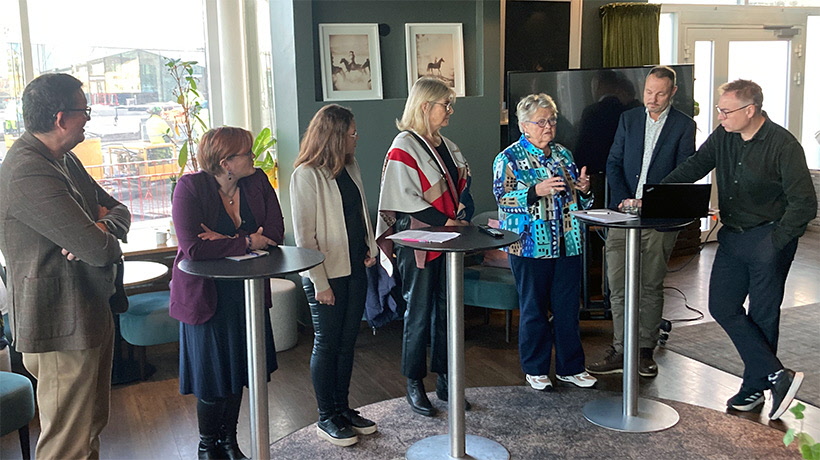 På bilden från seminariet syns: riksdagsledamot Mikael Dahlqvist (S), regionråd Marlen Ottesen (SD) Region Skåne, regionråd Malin Gabrielsson (KD), Region Västmanland, regionråd Anna Mannfalk (M), Region Skåne, förbundsordförande Eva Eriksson, SPF Seniorerna, generalsekreterare Niklas Arnberg, Pandemifonden, och moderatorn Anders Åkesson.
