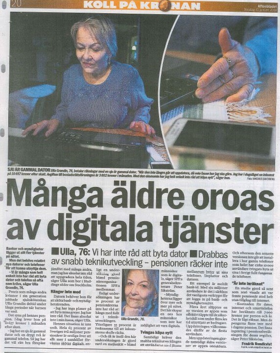 I artikeln uttalar sig också SPF Seniorerna-medlemmen Ulla Grandin, som berättar att många äldre, även om de är uppkopplade, inte har råd att byta dator eller telefon så ofta.