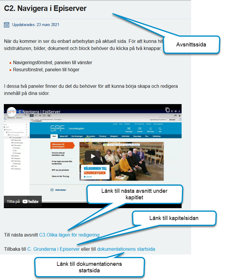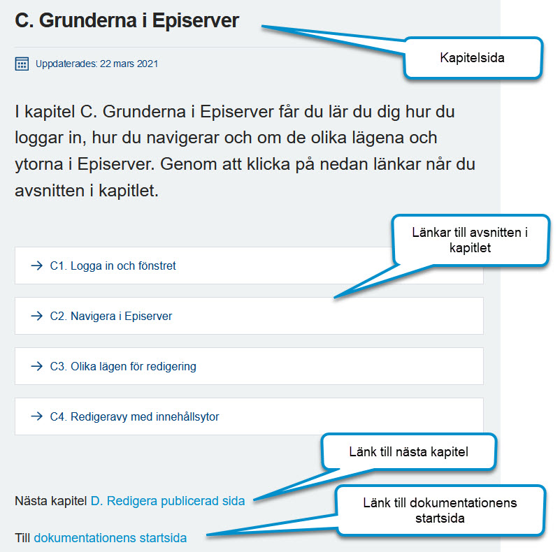 Du navigerar dig genom att klicka på kapitlet och sedan på en av avsnittslänkarna på kapitelsidan. Du landar då på en avsnittssida. Här kan du sedan gå till nästa avsnitt, tillbaka till kapitelsidan eller till dokumentationens startsida.