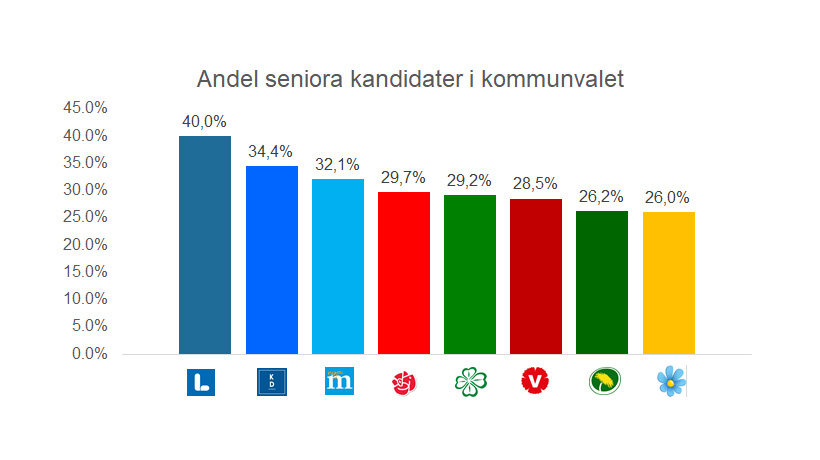 et finns idag inget riksdagsparti som ens på sina listor lever upp till de 27 procent som seniorer representerar av den röstberättigade befolkningen. Kristdemokraterna har bäst seniorrepresentation inför riksdagsvalet, med 25,5 procent seniorer, tätt följda av Liberalerna med 23,6 procent. Sämst är representationen av seniorer bland de tre största partierna. I botten är Socialdemokraterna som endast har 6,5 procent seniorer bland sina riksdagskandidater. Näst sämst är Moderaterna på 11,3 procent följda av Sverigedemokraterna på 11,9 procent.