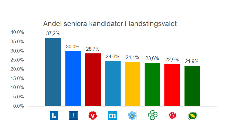 På landstingsnivå har partierna generellt fler seniora kandidater i jämförelse med riksdagen. Genomsnittet bland samtliga partier, även icke-riksdagspartier, är 26,3 procent. I topp bland riksdagspartierna är Liberalerna på 37,2 procent. Därefter följer Kristdemokraterna (30,0 procent), Vänsterpartiet (28,7 procent) och Moderaterna (24,6 procent). Sämst är Miljöpartiet, där endast 21,9 procent av kandidaterna är 65 år eller äldre.
