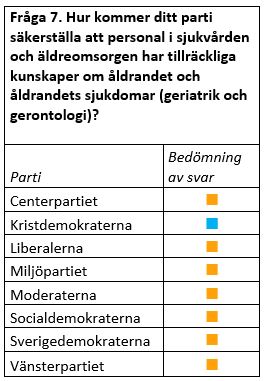 7. Hur kommer ditt parti säkerställa att personal i sjukvården och äldreomsorgen har tillräckliga kunskaper om åldrandet och åldrandets sjukdomar (geriatrik och gerontologi)?