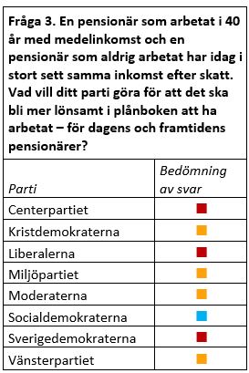 BEDÖMNING AV SVAREN: Gemensamt för Centerpartiet, Liberalerna och Sverigedemokraterna är att det i deras svar saknas förslag som skulle göra det mer lönsamt att ha arbetat för de som är pensionärer idag. Snarare resonerar de kring höjt grundskydd i linje med Grundskyddsutredningens förslag, som skulle innebära ett ännu mindre respektavstånd! Däremot kan både privat sparande och ett längre arbetsliv bidra till en något högre pension för dagens löntagare i framtiden. Man anar att politikerna inte känner något ansvar för den allmänna pensionens urholkning, tyvärr. Kristdemokraterna har inte heller några förslag för att stärka den allmänna pensionen, men däremot höjningar av bostadstillägget som går längre än Grundskyddsutredningen – bra för seniorer med bostadstillägg, minskat respektavstånd för de som inte har det. Moderaterna menar att det är orättvist att det är liten skillnad i pension mellan att ha arbetat och att aldrig ha arbetat, och satsar därför på breda skattesänkningar för pensionärer. Dessa kan visserligen göra det mer lönsamt att ha arbetat i plånboken, men enbart på kort sikt och det saknas förslag som rör pensionssystemet som sådant. Även från Miljöpartiet saknas konkreta förslag i sammanhanget men de anser att den allmänna pensionen ska stärkas och att avgiften ska ses över. Från Socialdemokraterna finns däremot ett konkret förslag, ett pensionstillägg riktat främst till dem pensionsinkomster runt medel. Detta skulle göra det mer lönsamt att ha arbetat på kort sikt och är ett första medgivande på att systemet inte levererar tillräckliga pensioner. Men beräkningar för och detaljer om S-förslaget saknas, det berör inte alla pensionärer och köpkraftstillskottet skulle ätas upp inom några år (i juli kom S med ett förslag på att höja pensionsavgiften, detta berör dock inte pensionsnivåerna för dagens pensionärer). Till sist Vänsterpartiet som inte är nöjda och vill ha ett nytt pensionssystem, men lite oklart hur det ska se ut och vad det ska baseras på.